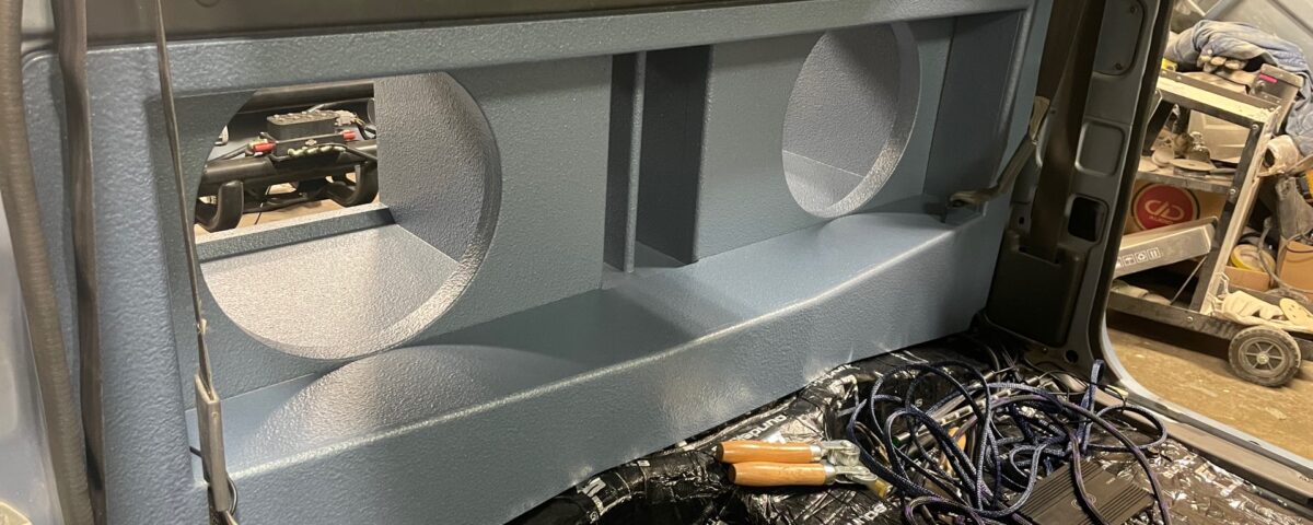 Interior view of the rear cabin enclosure with a textured blue finish, ready for subwoofer installation. The design blends structure, tone control, and clean presentation.